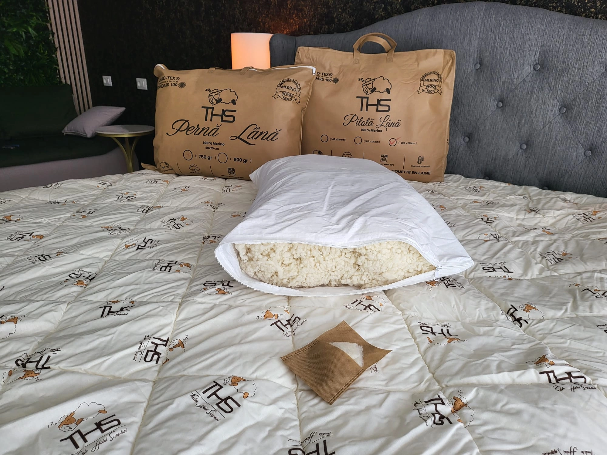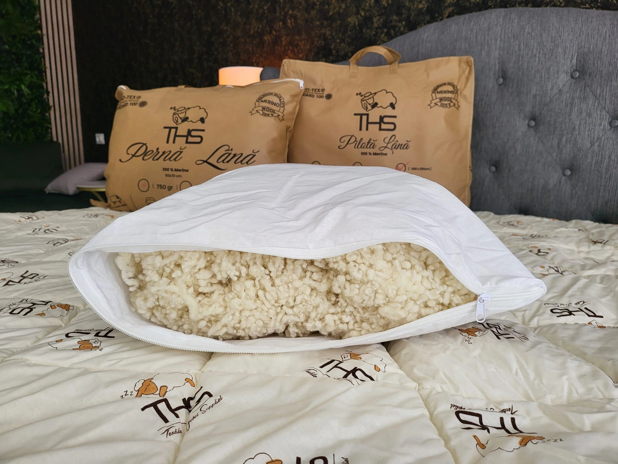 - Umplutură: 100% lână pură virgină, calitate merino